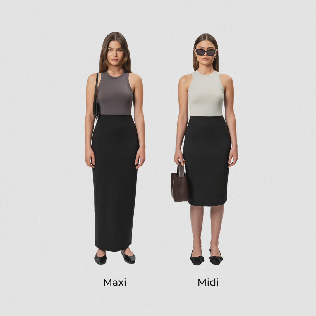 This full-length maxi skirt boasts a sophisticated aesthetic with the comforts of activewear. Its high-waisted, pencil silhouette and subtle middle back slit promise ease of movement while making a style statement.